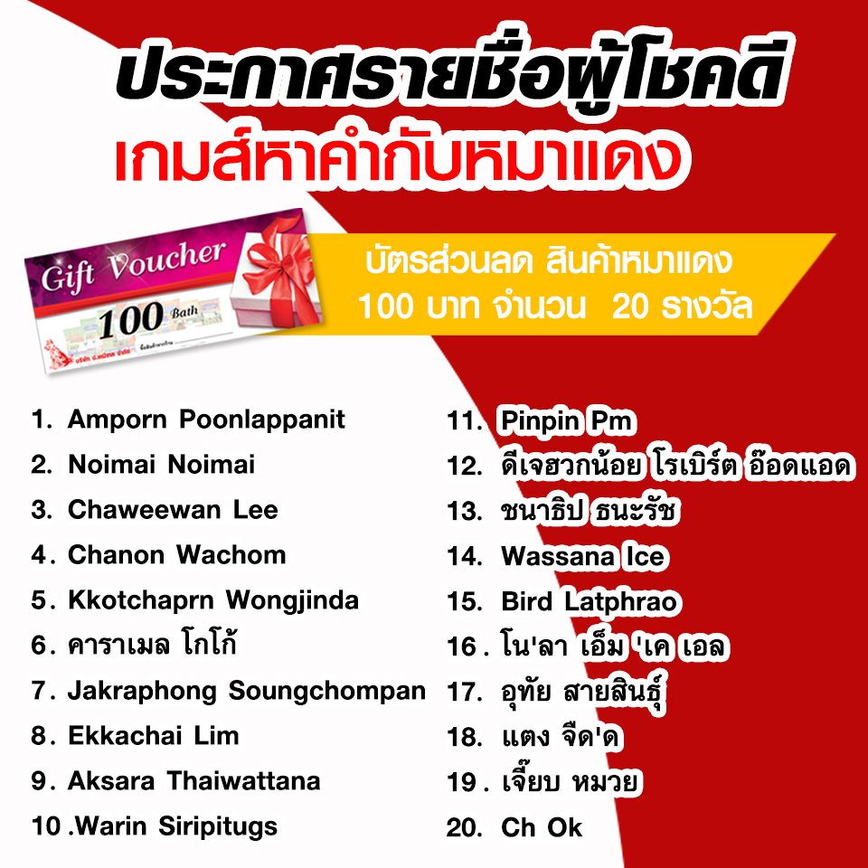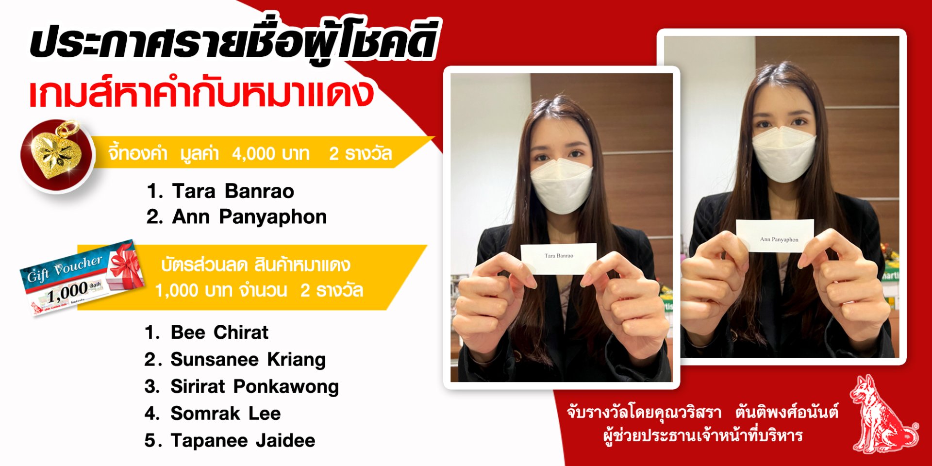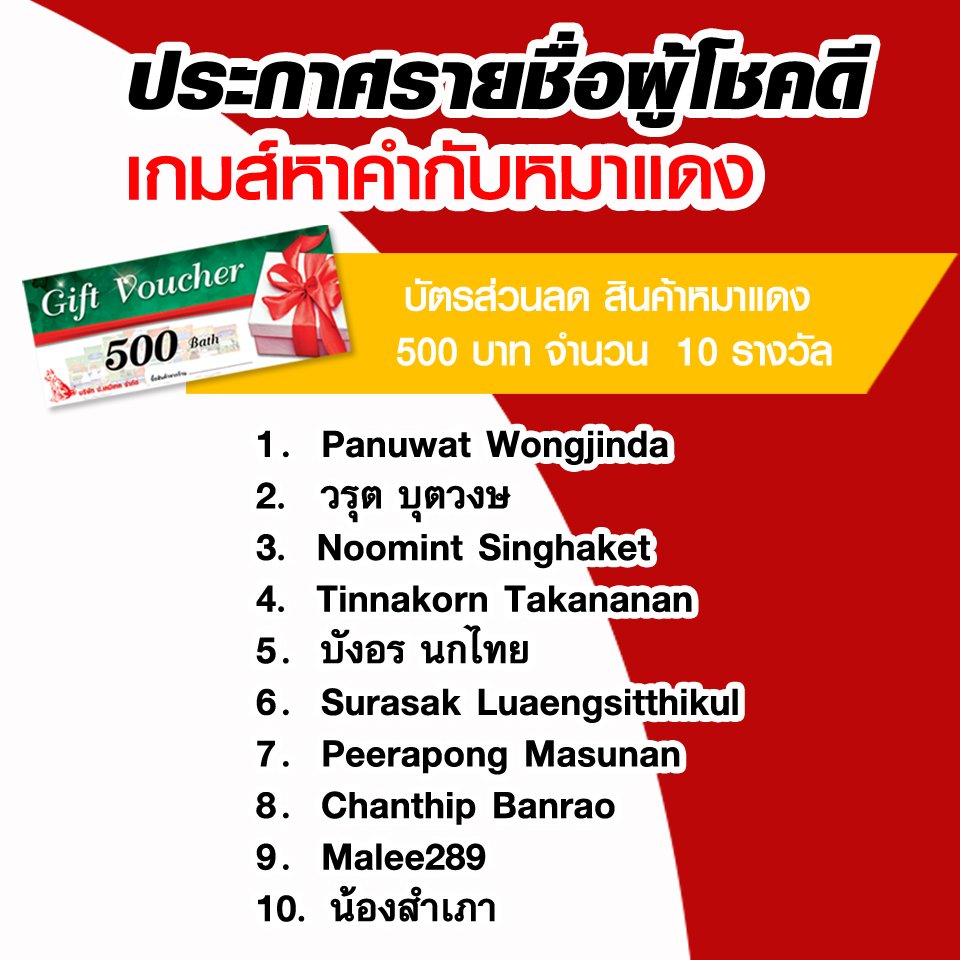 ประกาศรายชื่อผู้โชคดี เกมส์หาคำกับหมาแดง มาดูรายชื่อผู้โชคดีทางนี้ได้เลยค่ะ ทีมงานหมาแดง ต้องขอขอบคุณสมาชิกที่ให้ความสนใจร่วมสนุกนะคะ