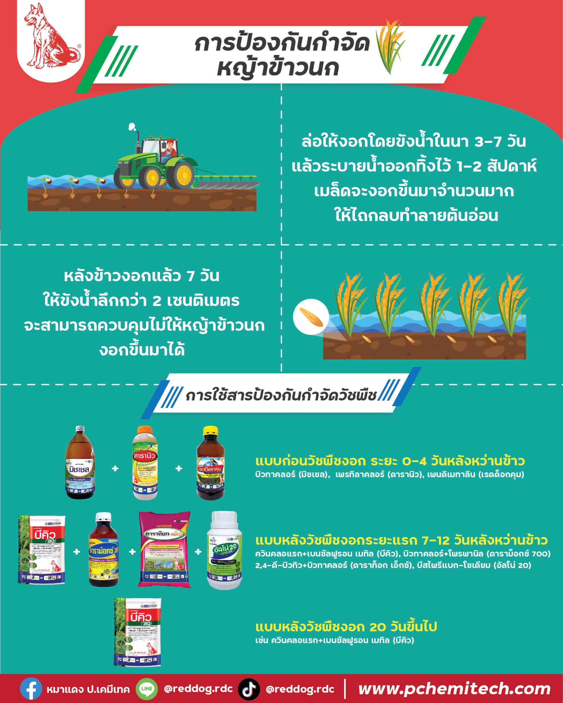 2.หลังข้าวงอกแล้ว 7 วัน ให้ขังน้ำลึกกว่า 2 เซนติเมตร จะสามารถควบคุมไม่ให้หญ้าข้าวนกงอกขึ้นมาได้ แต่ต้นที่งอกขึ้นมาก่อนหน้านี้แล้วจะสามารถเจริญเติบโตต่อไปได้